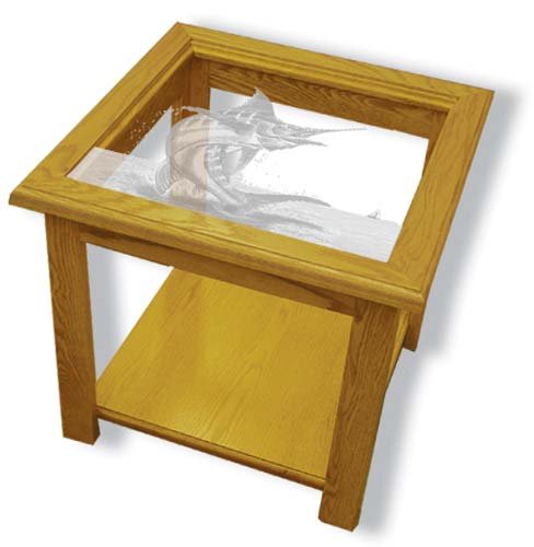 Oak Glass Top End Table With Marlin Fishing Etched Glass - Marlin Fishing End Table Furniture - Unique Marlin Fishing Gift Ideas - Fully Assembled - 22" x 22" x 20" high Feature