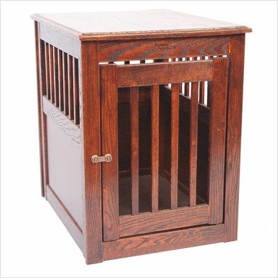 Don't let an ugly wire crate come between you and spending time with your best friend. This Oak End Table Pet Crate doubles as furniture, so your dog can be right where the action is and your living room will still look great. Handcrafted with care and attention to detail with classic lines and a rich finish, this crate looks refined and beautiful in any home. It's just the thing when company comes, or when it's time to settle in for nice, quiet evening. Features: · Uncompromising quality for lasting durability · Fine oak construction with a water based, Eco-Friendly finish · ExtiraTM MDF waterproof crate floor will not absorb liquids or odors · Accommodates standard crate pads and cushions (not included) · Swing-through door fastens shut or rotates inside for den-like, open access · Attractive (yet secure) hardware · Easy to assemble · Made in the U.S.A. Item Specifications: Size: Medium (18"L x 24"W x 27"H) Large (24"L x 36"W x 27"H) Color: Oak/Mahogany Oak/Cherryw