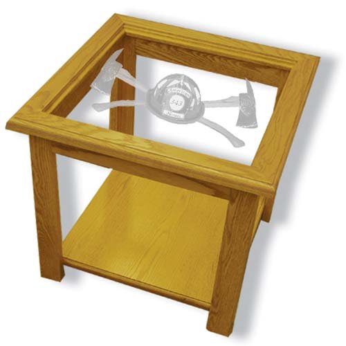 Oak Glass Top End Table With Firefighter Etched Glass - Firefighter End Table Furniture - Unique Firefighter Gift Ideas - Fully Assembled - 22" x 22" x 20" high Feature