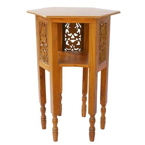 Add a beautiful accessory to your home or office decor with the elegance of this hexagonal side table, entirely hand-crafted from teak wood and featuring a rich natural pine colored finish. Perfect for display in your living room, bedroom, hallway or entry, this unique side table features three hand-carved side panels with an intricate floral design. Providing plenty of space to store all your essentials, the table top and interior tier await the display of your family photographs, clock, magazines or anything else you can imagine. Six attractively carved legs each connect to a side panel, providing balance and strength for the longevity of this valuable piece. Measures 30 inches high x 22 inches long x 22 inches wide. AsiaEXP brings you authentic, handcrafted goods from a variety of world cultures. With this purchase you are not only receiving a beautiful product, but you are supporting the artisans and helping them to pursue their craft. The couple who made this piece left the back-breaking work of an agrarian life to pursue careers as artisans. Every piece is hand-carved with exceptional attention to detail to ensure an individual design. The handcrafted nature of this product will produce minor differences in design and sizing. Subtle variations will occur from piece to piece, adding to its unique qualities. Measurements may vary slightly. No assembly required.