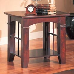 This casual contemporary end table will add great style and functionality to your living room perfect placed next to a chair or sofa. The table s arched sides with open grid work offer a subtle and sophisticated mission influence. Place a lamp or your favorite decorative items on this table for a personal touch in your space. A lower shelf offers more space for decorative items. In a warm dark Cherry finish this end table will blend beautifully with your living room decor.The Abernathy End Table with Shelf by Coaster is available in the area from Coaster.