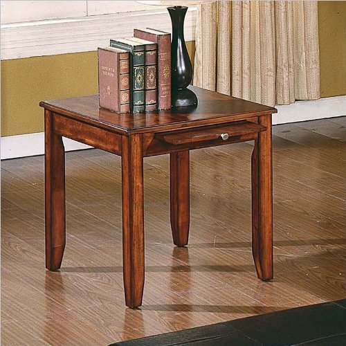 Styled in a cherry finish our square end table from the Brewster collection is versatile with a pull out tray. Table is finished for a distressed design. Features: Contemporary style Cherry finish Made of hardwood solids Tapered legs Slide out tray Specifications: Overall dimensions: 25H x 26D x 24W inches Weight: 32.5 lbs.