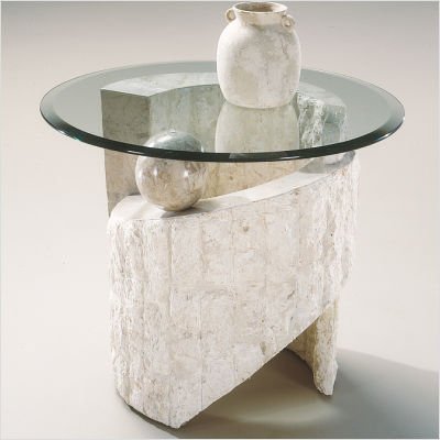 58504 Features: -Round end table. -Ponte Vedra collection. -Stone finish. -Mactan fossil construction. -Polished pastor fossil stone. -Contemporary style. -0.375'' Patterned beveled glass tops creating an airy lightness in contrast to the solid bases. -Interior neutral color palettes. -Assembly required.