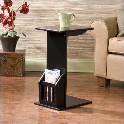 Crafted from solid Asian hardwoods with a sleek black finish, this handy snack table makes an ideal accent piece for the living room, playroom, or even bedside. The in.Cin. shape allows this unit to be nestled up against the couch as a drink, snack, remote, or book holder while the back side hosts a useful magazine holder. This wonderfully useful table is a smart addition to any home.